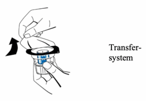 Das Transfersystem muss zuerst auf das Fläschchen mit dem Lösungsmittel und dann auf die Flasche mit dem lyophilisierten Pulver aufgesetzt werden. Andernfalls kommt es zu einem Verlust des Vakuums, und das Lösungsmittel kann nicht überführt werden.